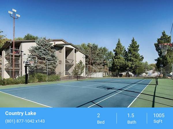 Country Lake, a premiere apartment community nestled in the convenience of Salt Lake City, Utah is a world of serenity and beauty designed to relax the spirit and refresh the soul. At Country Lake Apartments, you will experience spacious one bedroom and two bedroom homes with features that will rejuvenate the senses; gas fireplaces, washer and dryer connections, large closets, central heating and air, and private balconies. You will enjoy our array of community amenities; tennis court, swimming pool, playground, dog park, controlled access, garages, and resident lounge. Country Lake is centrally located with easy access to I-15, I-215, and public transportation. Our community is a pet lovers dream! We proudly accept both cats and dogs with no weight limit. The expansive grounds offer numerous areas to walk your dog, including our dog park, or enjoy an afternoon stroll with your furry friends at one of the many nearby parks. Your new home at Country Lake will be a relaxing retreat from the world outside. Make your move and visit Country Lake Apartments today!