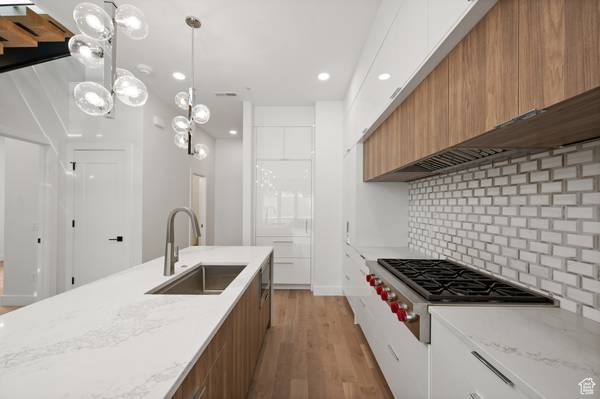 This luxury end-unit loft apartment located above Protein Foundry in the back of the building (away from 900 south) is quiet and serene with an abundance of natural light. The primary suite hosts a walk-in closet and on-suite bathroom with high-end shower system. The guest bedroom has on-suite bathroom and laundry closet with LG washer and dryer. The upscale kitchen offers an incredible space to cook, eat, work, and entertain with custom two-tone cabinets, waterfall quartz countertops, custom backsplash and lighting, Wolf gas range, Sub-Zero refrigerator, and Bosch dishwasher and microwave drawer. The open living and dining space is bright and open with high ceilings.