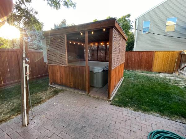 Step outside to a beautifully landscaped backyard featuring a **cabana-style gazebo