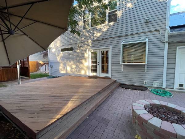and **stone gas fire pit** perfect for relaxing or entertaining. The large wooden deck is ideal for summer barbecues, and the lush front yard adds great curb appeal.