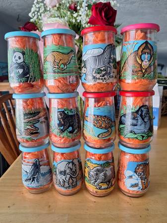 The collection includes jars for animals such as the Giant Panda, Cheetah, Grevy's Zebra, Mandrill, American Crocodile, Spectacled Bear, Hawksbill Sea Turtle, Mountain Gorilla, Humpback Whale, Asian Elephant, Black Rhino, and Siberian Tiger.its all 12