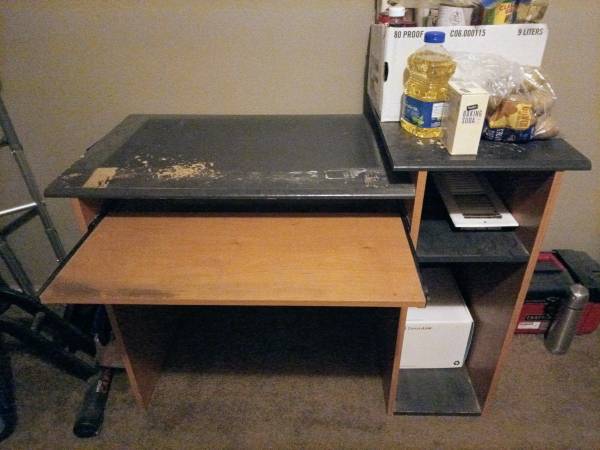 Desk roll out writing area has wear on top it's heavy bring a truck and help you could refinish it paint it whatever I need it out last chance get it before Nov 15 moving !